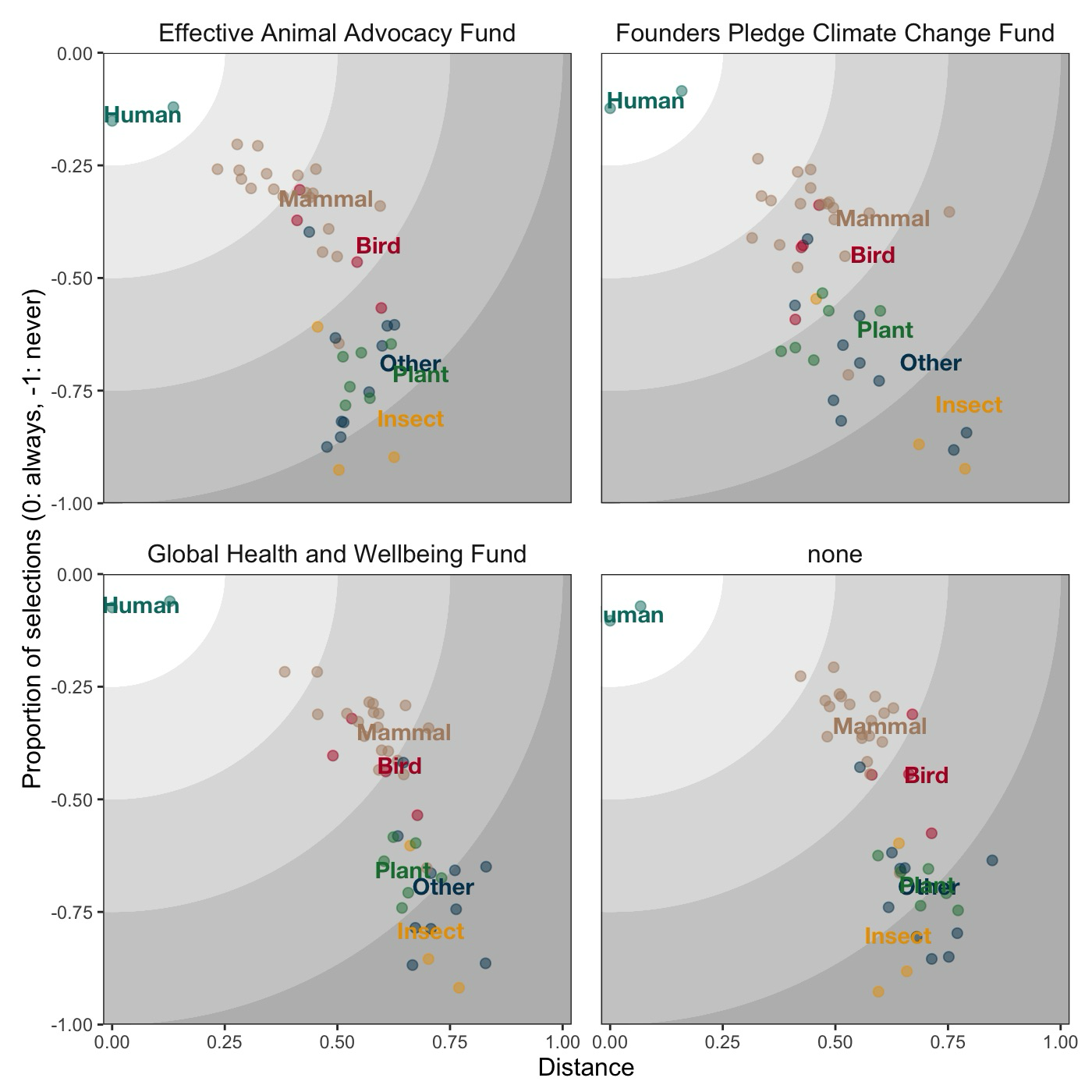 Two key findings emerged. The first is a clear pattern in the prioritised entities. Overall, people tended to feel closer to humans, followed by other animals such as mammals, birds and cephalopods, and then plants, molluscs and insects. However, there were also some identity-based disparities, for example in the charities participants chose to donate to.