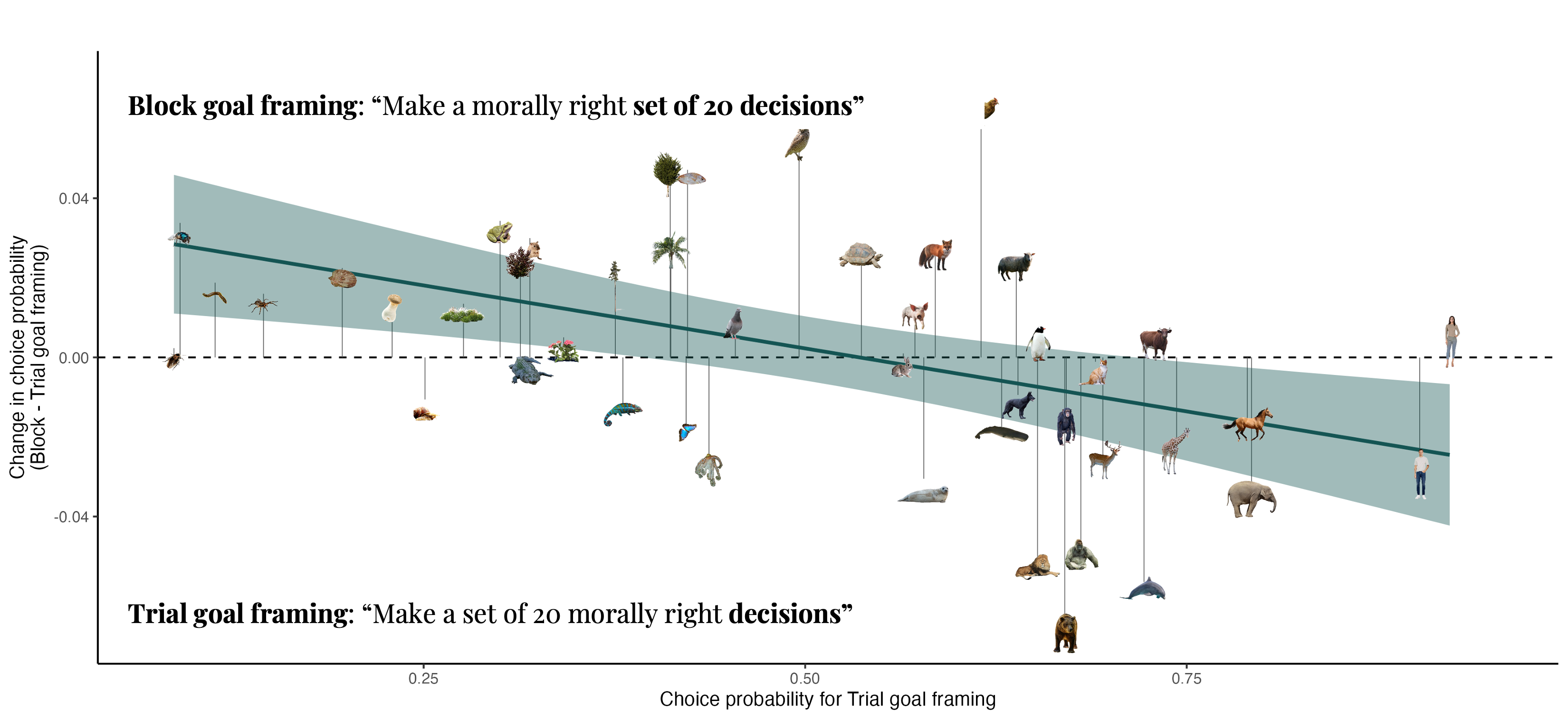 This suggests that the framing of the decision might encourage people to make room for entities that may not be particularly charismatic, familiar, or close to us, yet are essential maintaining ecological balance, biodiversity or in general a greater wellbeing.